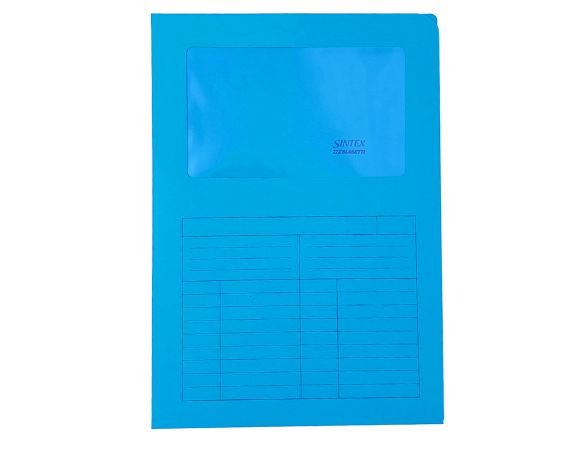 Cartelle con finestra da 120 g/mq. Formato 22x31 cm. Certificate FSC. Tinta pastello in colore azzurro.