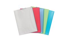 Copertine in polipropilene semirigido trasparente da 0,5 mm. Buste interne fisse in polipropilene cristallo liscio alta trasparenza. Formato 24x32 cm. 5 colori assortiti: rosso, verde, azzurro, turchese, trasparente.